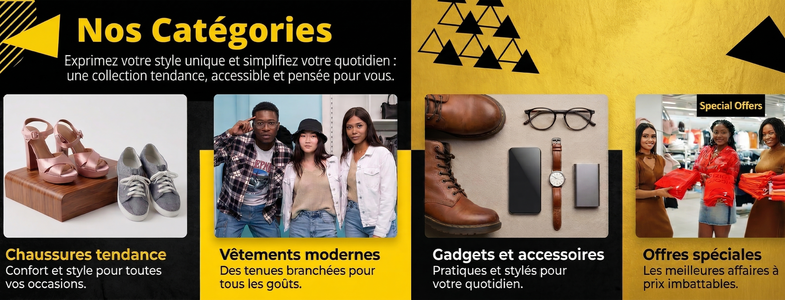 Découvrez notre sélection exclusive de chaussures, vêtements et gadgets. Nous vous offrons le style dont vous rêvez, sans vous ruiner. Chaque pièce est choisie avec soin pour sa qualité et son design tendance, pour que vous puissiez exprimer votre style unique.